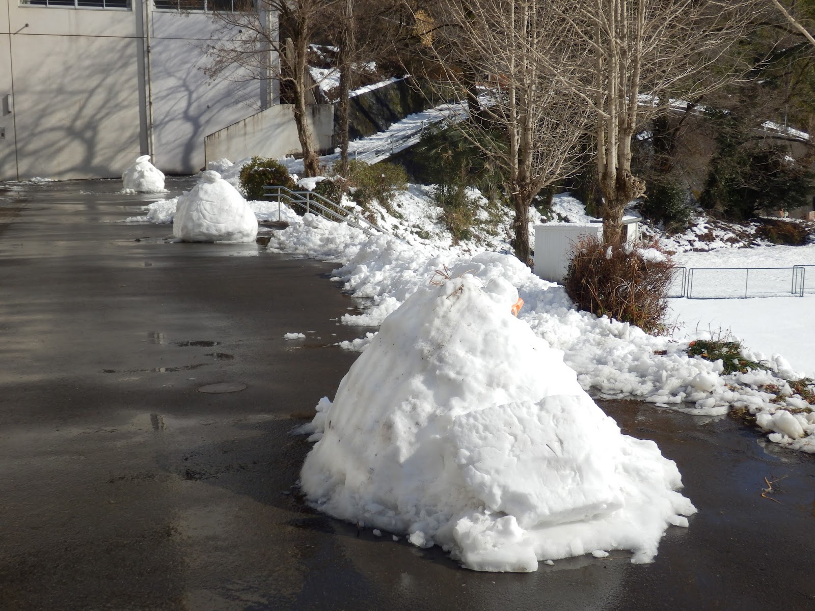 1月23日(火)の午前中、校地内の除雪をしていた3年生男子が、クラス対抗の雪像コンテストを行いました。モチーフはもちろんスクールキャラクターの「たぶポッポ」です。