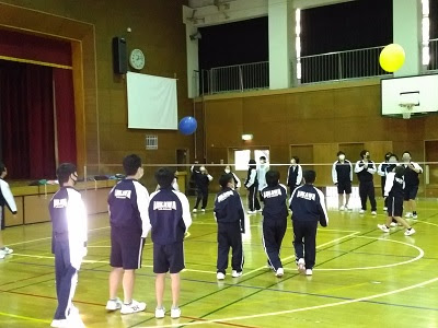 11月29日(月)昼休み、1年生が体育館で「ジャンボバルーンバレーボール」をして楽しい時間を過ごしました。先週末までの2学期期末試験で不安や焦り、緊張と戦ってきた生徒に向けて、心身のリフレッシュを目的に職員が企画しました。直径1メートルにも迫るようなものからよく見かける一般的な風船の大きさまで、4種類のサイズのバルーンが用意されていました。ネットを挟んで、出席番号の奇数組と偶数組に分かれて、楽しくラリーの応酬が行われていました。なかなか落ちてこないバルーンにやきもきしながらも、懸命に相手コートに打ち返そうとしている表情からも、試験が無事終了したという開放感が感じられました。