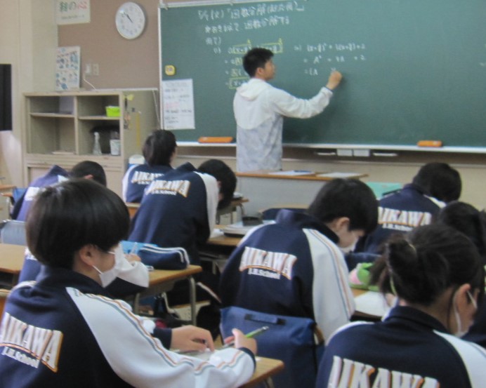 3年生の数学は、少人数指導を行っています。クラスの半分ずつなので、先生もきめ細やかに生徒とやり取りを行いながら学習を進めることができます。