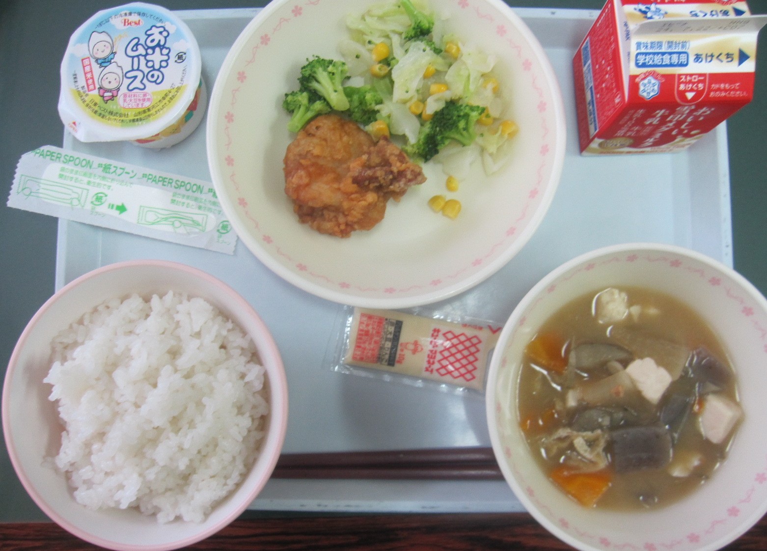 「ご飯を中心とした栄養バランスの良い献立」ということで、鶏のから揚げ、具だくさんみそ汁、ブロッコリーのサラダ、そしてしめくくりは「お米のムース」でした。